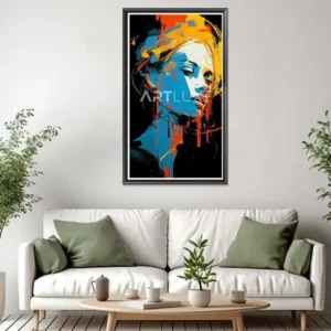 Tableau représentant un visage de femme avec des éclaboussures de peinture colorée partout