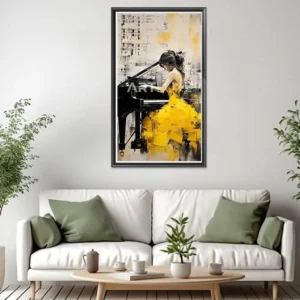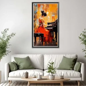 Découvrez notre Tableau femme assise devant un piano recouverte de poudre colorée. Une création artistique exceptionnelle pour embellir votre décor intérieur.