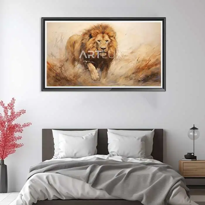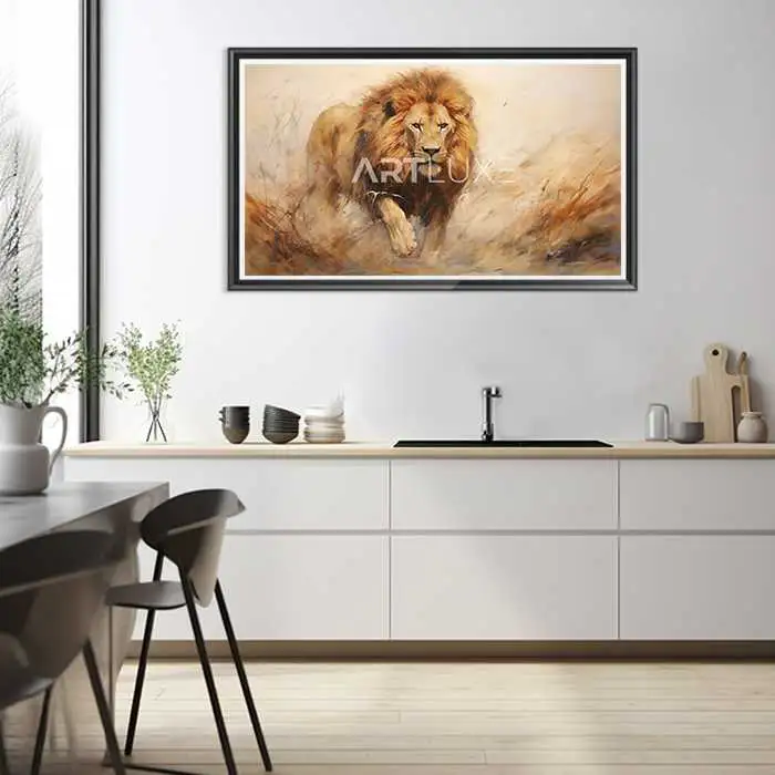Découvrez notre Tableau lion courant dans un champ. Une œuvre d’art remarquable pour sublimer votre intérieur avec sophistication.