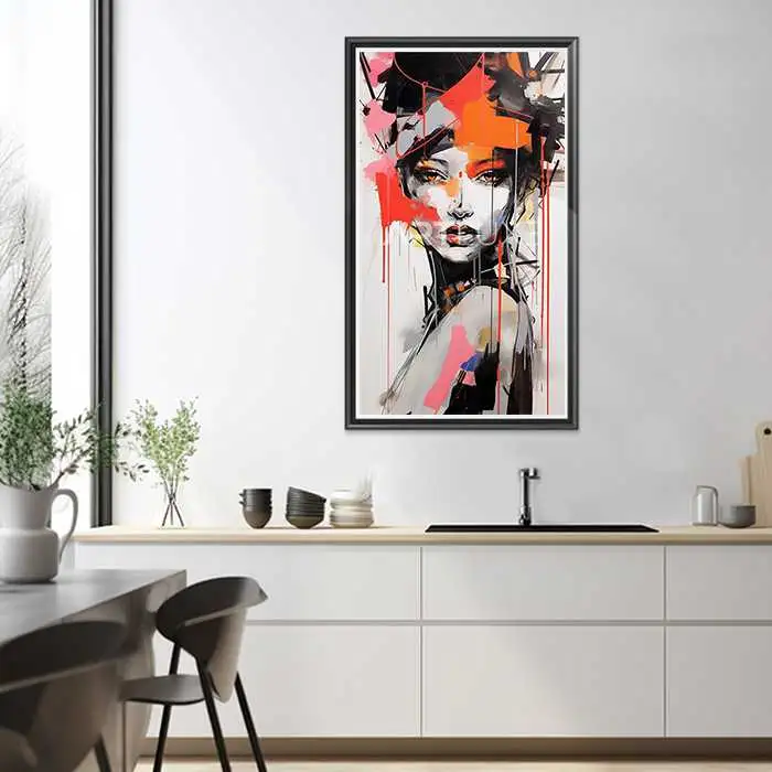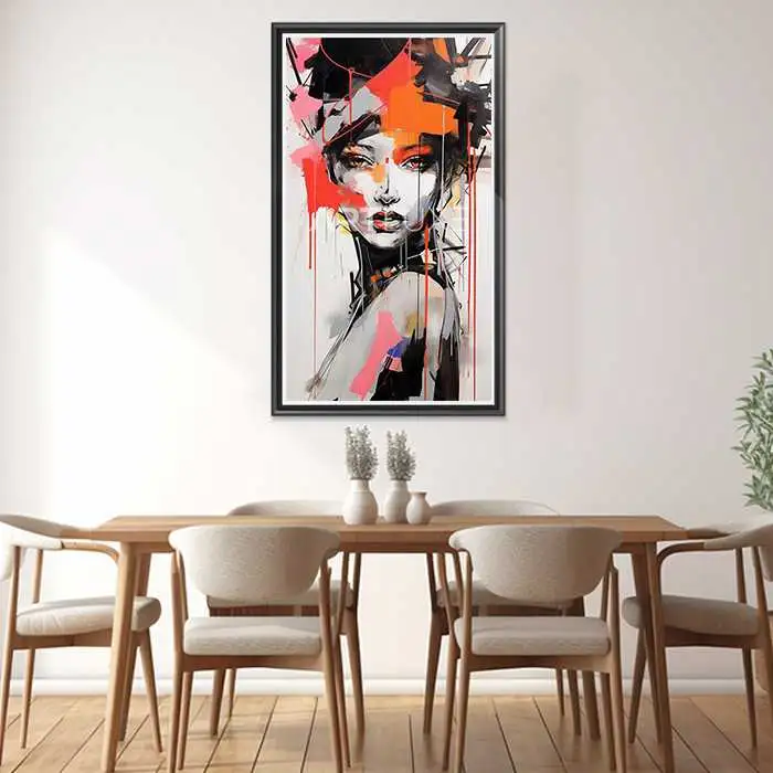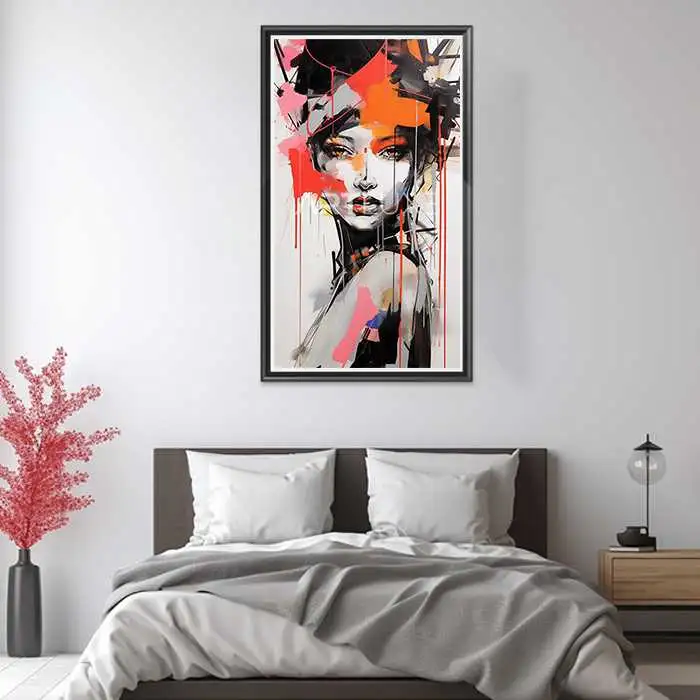 Découvrez notre Tableau Portrait femme style graffiti contraste élevé. Une création exceptionnelle pour ajouter une touche de caractère à votre décoration intérieure.